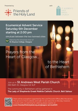 Saturday 6th December 2pm. St Andrews West Parish Church, 260 Bath St, Glasgow, G2 4JP. The community in Bethlehem will be gathered in The Lady of Shepherds Greek Melkite Catholic Church, Beit Sahour, as there will be a Simulcast between the two churches in the twinned cities.